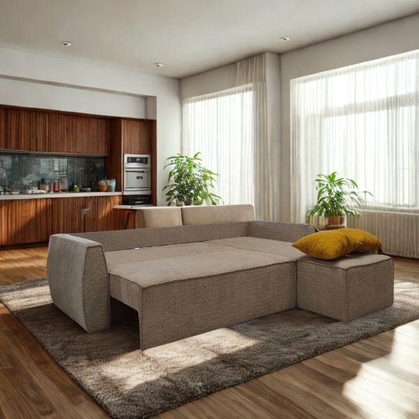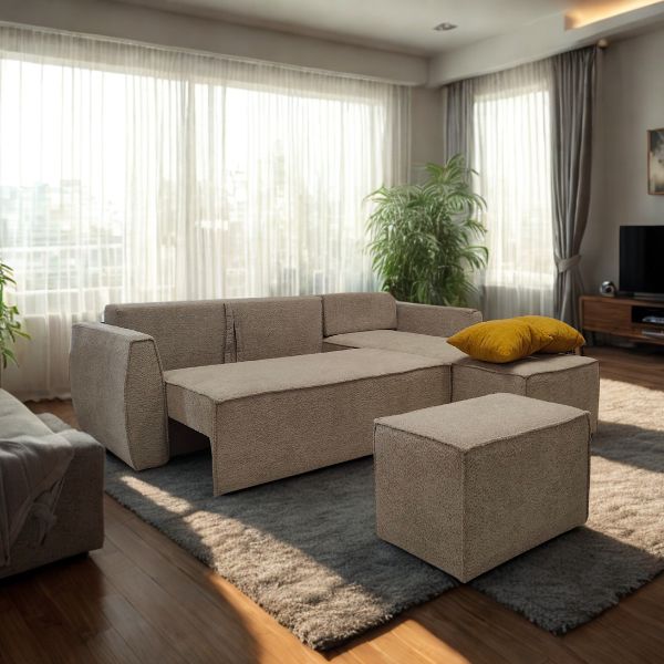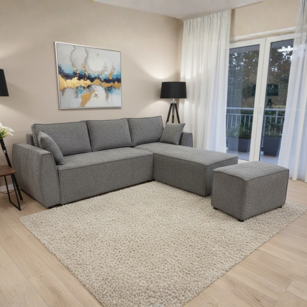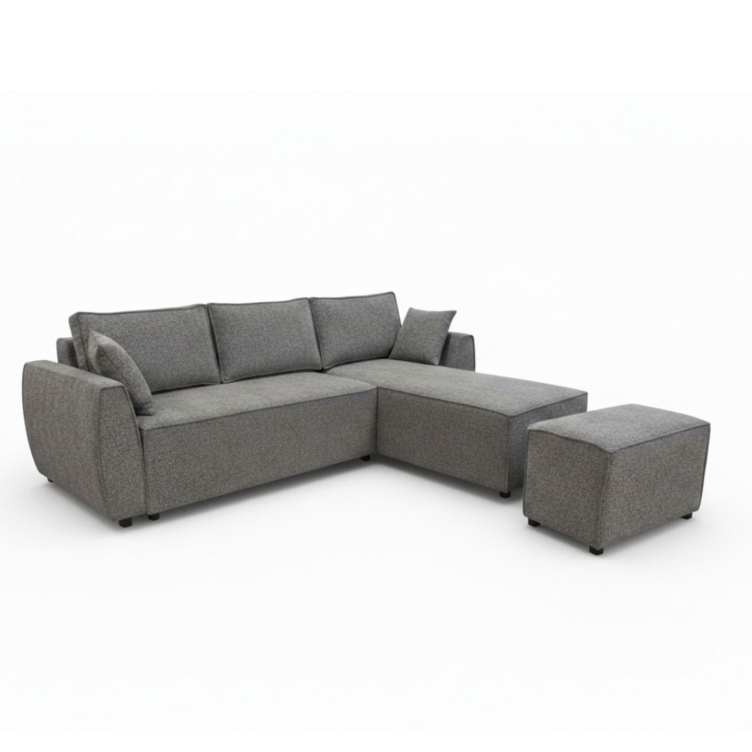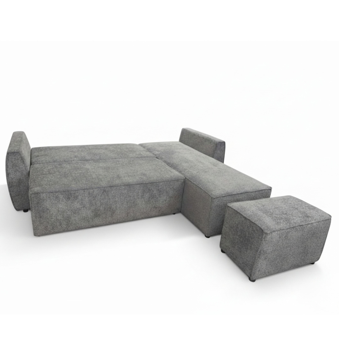 Аголна гарнитура Хуго со табуретка е дизајнирана специјално за мали станови и ограничен простор. Нејзиниот модерен и минималистички изглед се вклопува совршено во секој ентериер, додека нејзината мултифункционалност ја прави идеален избор за урбан животен стил. Благодарение на практичниот механизам, лесно се трансформира во удобен лежај за спиење со димензии 250×130 см, а вградената кутија за складирање овозможува дополнителен простор за постелнина, ќебиња или други предмети.