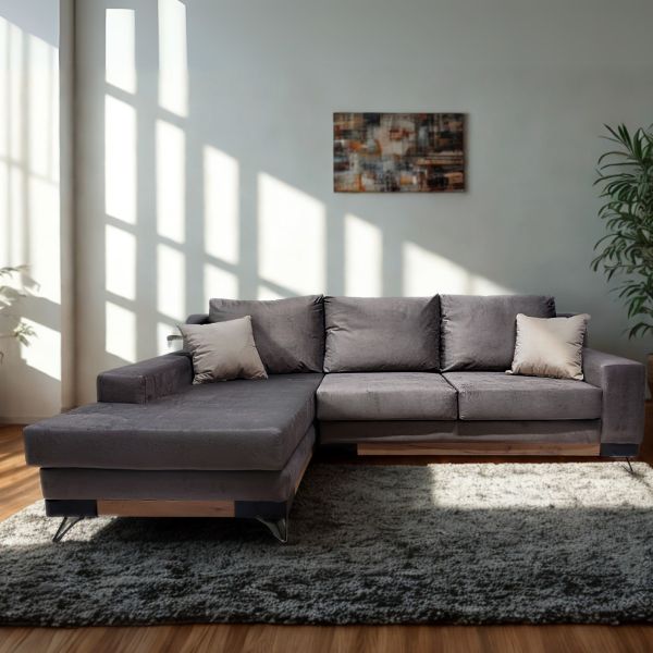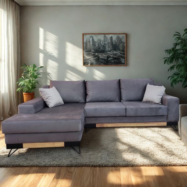 Аголната гарнитура Константин претставува хармоничен баланс меѓу современ дизајн и класична елеганција. Со внимателно избалансиран однос на модерни и традиционални линии, таа внесува топлина и карактер во секоја дневна соба. Овој модел не е само визуелно привлечен, туку и исклучително практичен – благодарение на вградениот механизам за спиење, гарнитурата лесно се трансформира во удобен кревет со површина од 200×140 cm, идеален за гости или секојдневна употреба. Комбинацијата на метални ногарки и дрвени декоративни детали ѝ дава елегантен контраст и современ изглед, додека висококвалитетната ткаенина овозможува пријатно чувство и лесно одржување.