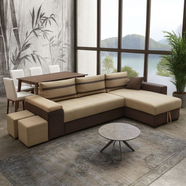 Аголна гарнитура Монако располага со две кутии за складирање, кои овозможуваат лесна организација на постелнина, ќебиња или перници, задржувајќи ја просторијата секогаш уредна. Покрај тоа, гарнитурата има вграден механизам за спиење, со што едноставно се трансформира во удобен лежај со површина од 260 × 153 см идеален за секојдневно користење или за сместување гости. Дополнителна предност се две практични табуретки кои можат да се сместат во самата страница на гарнитурата, обезбедувајќи дополнителен простор за седење без да го нарушат елегантниот изглед на целиот сет. Седиштето е изработено со жичано јадро кое овозможува одлична поддршка, еластичност и трајна удобност при користење.
