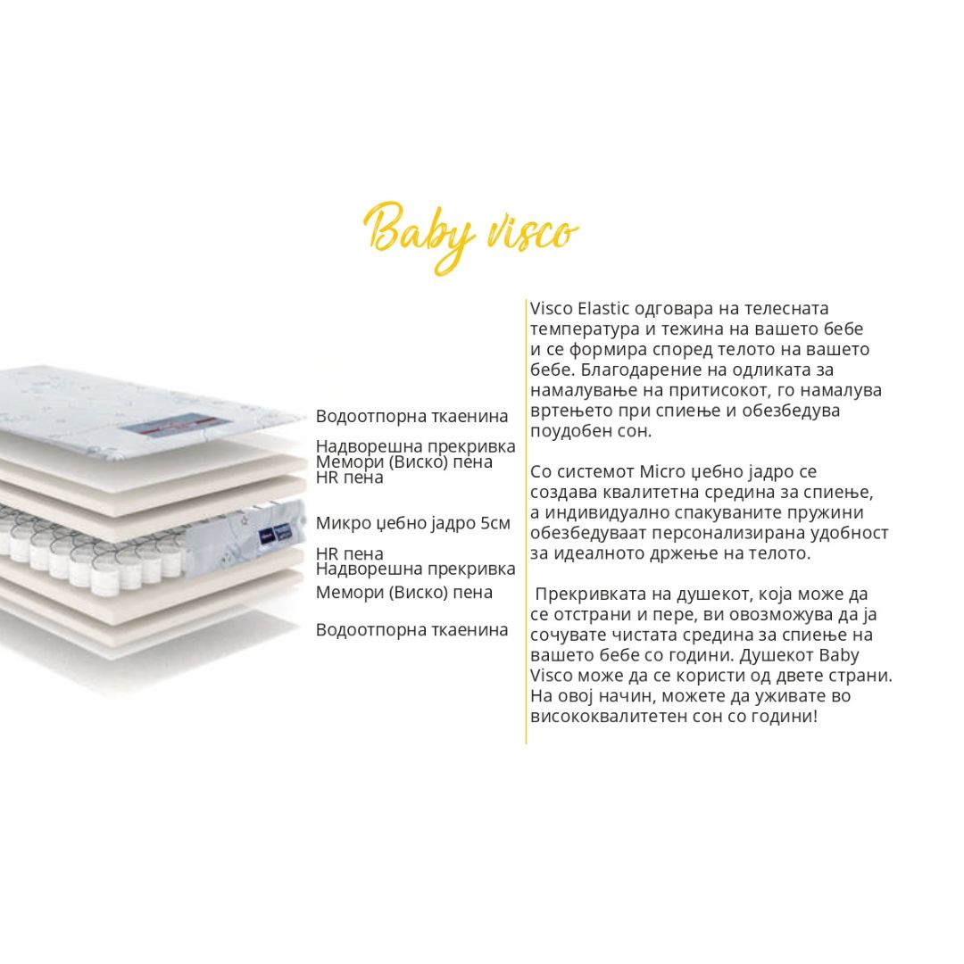 Навлаката на детскиот душек има патент што овозможува лесно отстранување и перење. За целосно задоволување на потребите на Вашето дете, можете да изберете еден од двата дезени на душеци Baby Visco — за девојчиња и за момчиња.