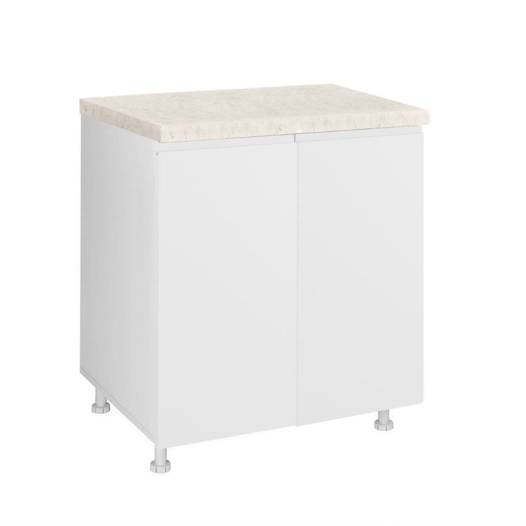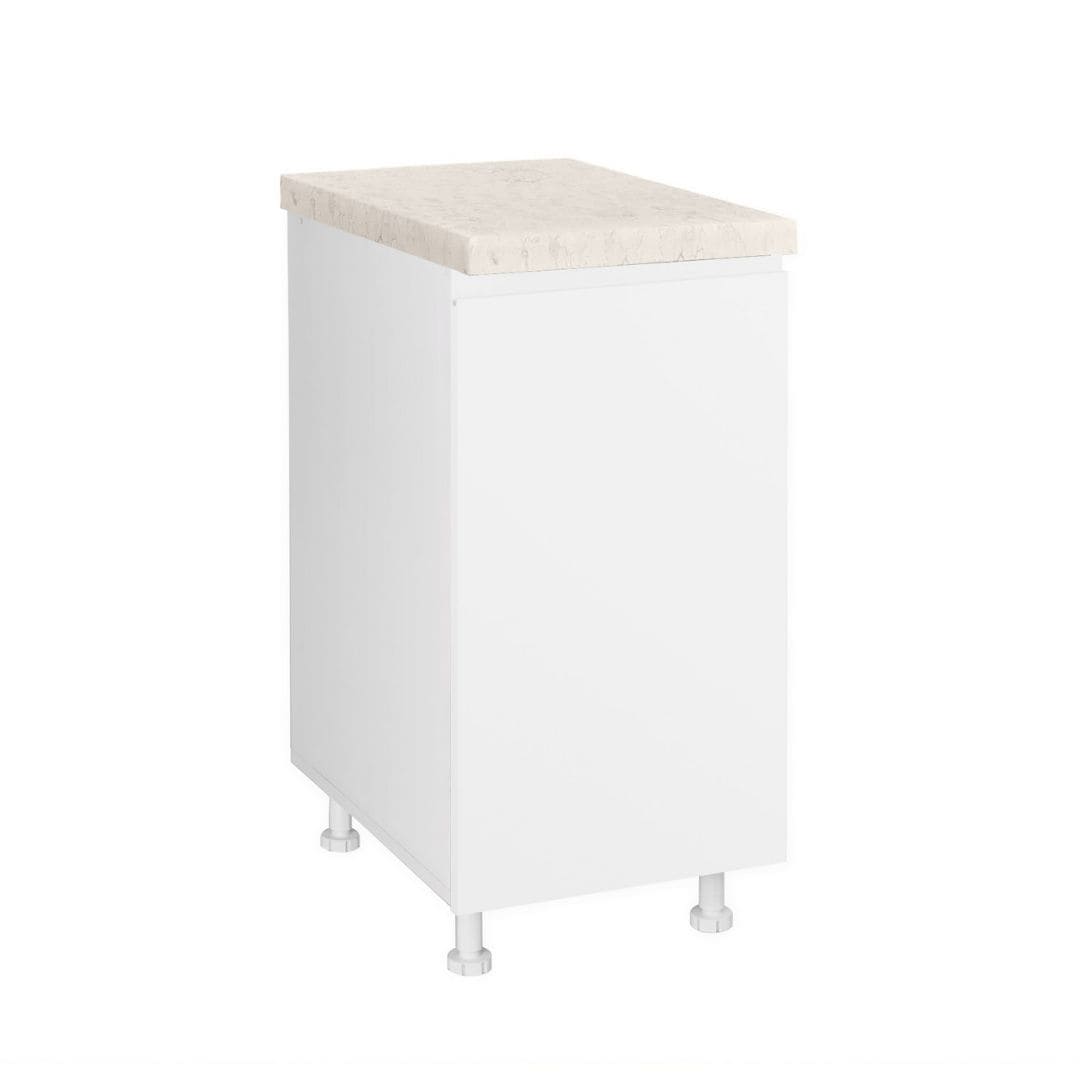 - Висината на пултот изнесува 820 мм, додека ширината на работната плоча се прилагодува според избраните елементи и секогаш е поширока за дополнителни 8 см. Работната плоча е со дебелина од 38 мм и е достапна во декорите F206 Црн мермер и K704 Перлино.