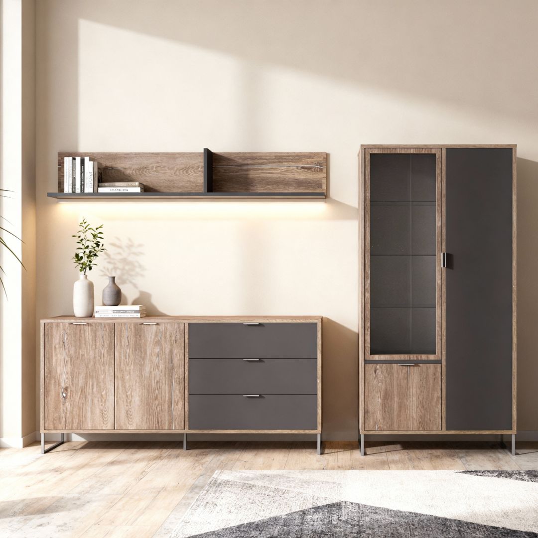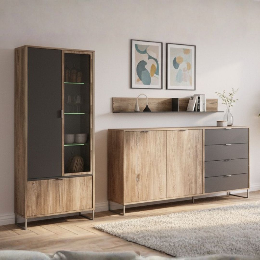 Мебелот од серијата Денвер претставува совршен избор за сите кои бараат модерна, функционална и уредна дневна соба. Овој висококвалитетен сет е изработен од универ 18 mm и комбинира елегантен дизајн, практични решенија за складирање и трајни материјали. Металните ногари и рачки обезбедуваат дополнителна стабилност, а изборот на современ декор Храст Калај + Антрацит овозможува лесно вклопување во секој ентериер. Овој комплет за дневна соба ги содржи сите неопходни елементи за максимална организација, стил и удобност: