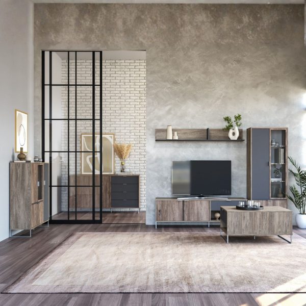 Мебелот од серијата Денвер претставува совршен избор за сите кои бараат модерна, функционална и уредна дневна соба. Овој висококвалитетен сет е изработен од универ 18 mm и комбинира елегантен дизајн, практични решенија за складирање и трајни материјали. Металните ногари и рачки обезбедуваат дополнителна стабилност, а изборот на современ декор Храст Калај + Антрацит овозможува лесно вклопување во секој ентериер. Овој комплет за дневна соба ги содржи сите неопходни елементи за максимална организација, стил и удобност:
