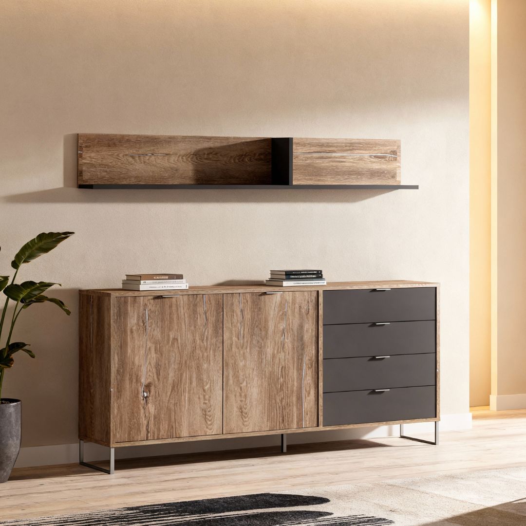 Мебелот од серијата Денвер претставува совршен избор за сите кои бараат модерна, функционална и уредна дневна соба. Овој висококвалитетен сет е изработен од универ 18 mm и комбинира елегантен дизајн, практични решенија за складирање и трајни материјали. Металните ногари и рачки обезбедуваат дополнителна стабилност, а изборот на современ декор Храст Калај + Антрацит овозможува лесно вклопување во секој ентериер. Овој комплет за дневна соба ги содржи сите неопходни елементи за максимална организација, стил и удобност:
