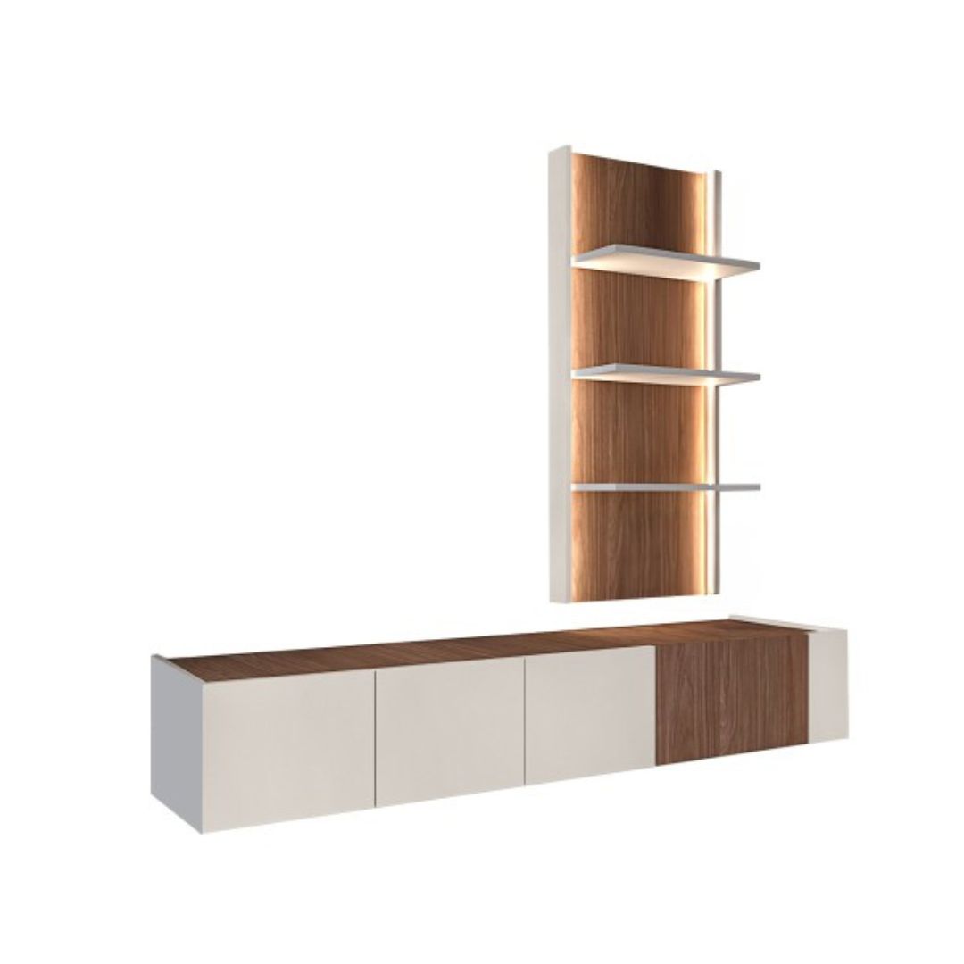 Смарт полицата со лед осветлување (димензија 54,5x22x121) е дизајнирана да го надополни изгледот на комодата, овозможувајќи просторно и стилско изложување на книги, фотографии и украсни детали.