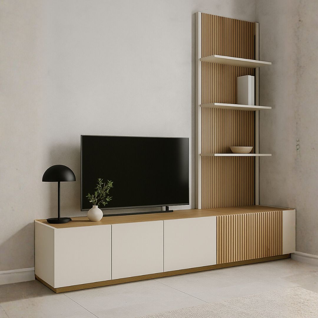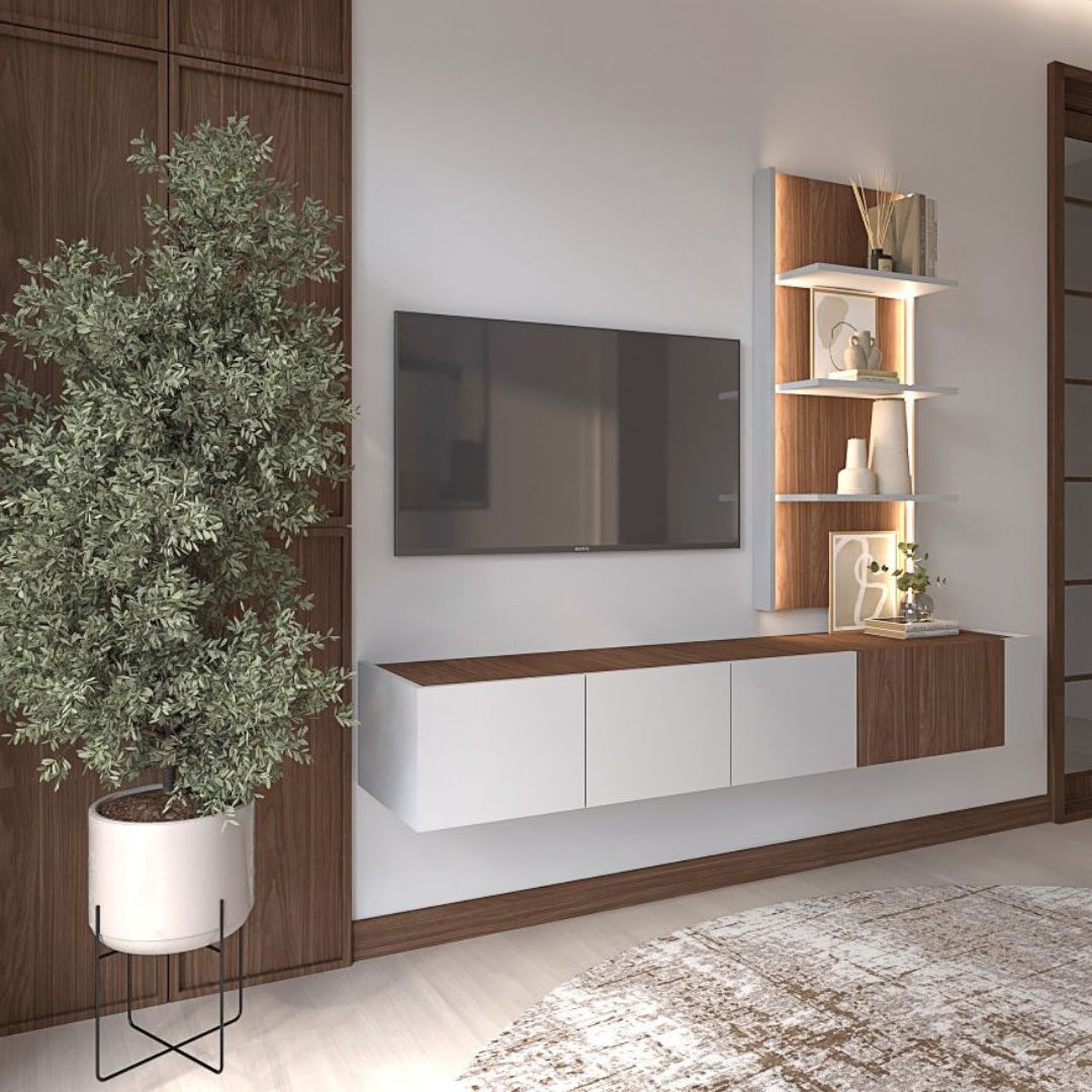 - Комплетен визуелен баланс меѓу ТВ комода и полица