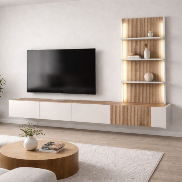 Дневна соба Смарт – ТВ комода и полица со лед осветлување во совршен баланс