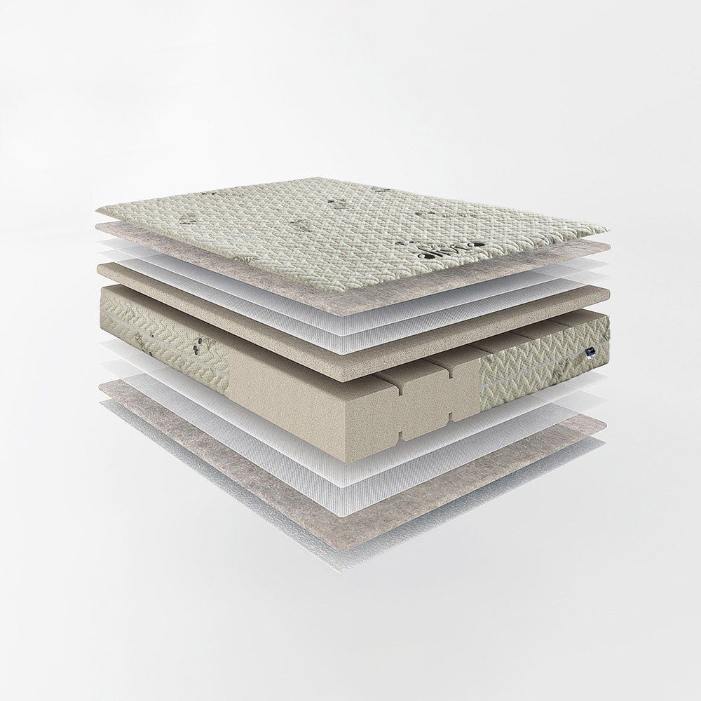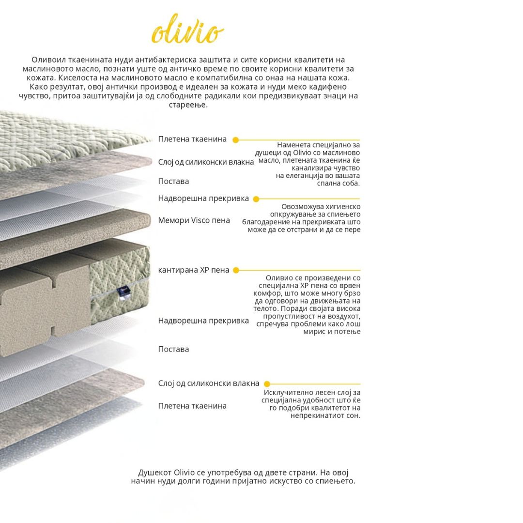 Овој душек нуди совршен спој на природна нега и технолошка поддршка, благодарение на уникатната комбинација од ткаенина збогатена со маслиново масло, Visco мемори пена и ХР пена со 7 зони. Навлаката со маслиново масло нуди природна антибактериска заштита и грижа за Вашата кожа. Благодарение на својствата на маслиновото масло – кое уште од антички времиња се смета за благодет – кожата останува свиленкаста, хидрирана и заштитена од слободните радикали што предизвикуваат стареење. Киселоста на маслиновото масло е совршено усогласена со природната pH вредност на кожата, што го прави идеален избор за чувствителни лица. Во срцето на душекот се наоѓа Visco мемори пената, првично развиена од НАСА. Овој материјал реагира на топлина и притисок, совршено се обликува според контурите на телото, нудејќи оптимална поддршка и максимален комфорт. Благодарение на структурата со отворени ќелии, Visco пената овозможува душекот да „диши“ и да остане свеж во текот на целата ноќ.