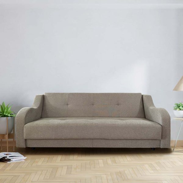 Кауч Тоби – модерен тросед со клик-клак механизам, жичано јадро и простор за складирање, што лесно се претвора во лежај – совршен за практичен и удобен дом.