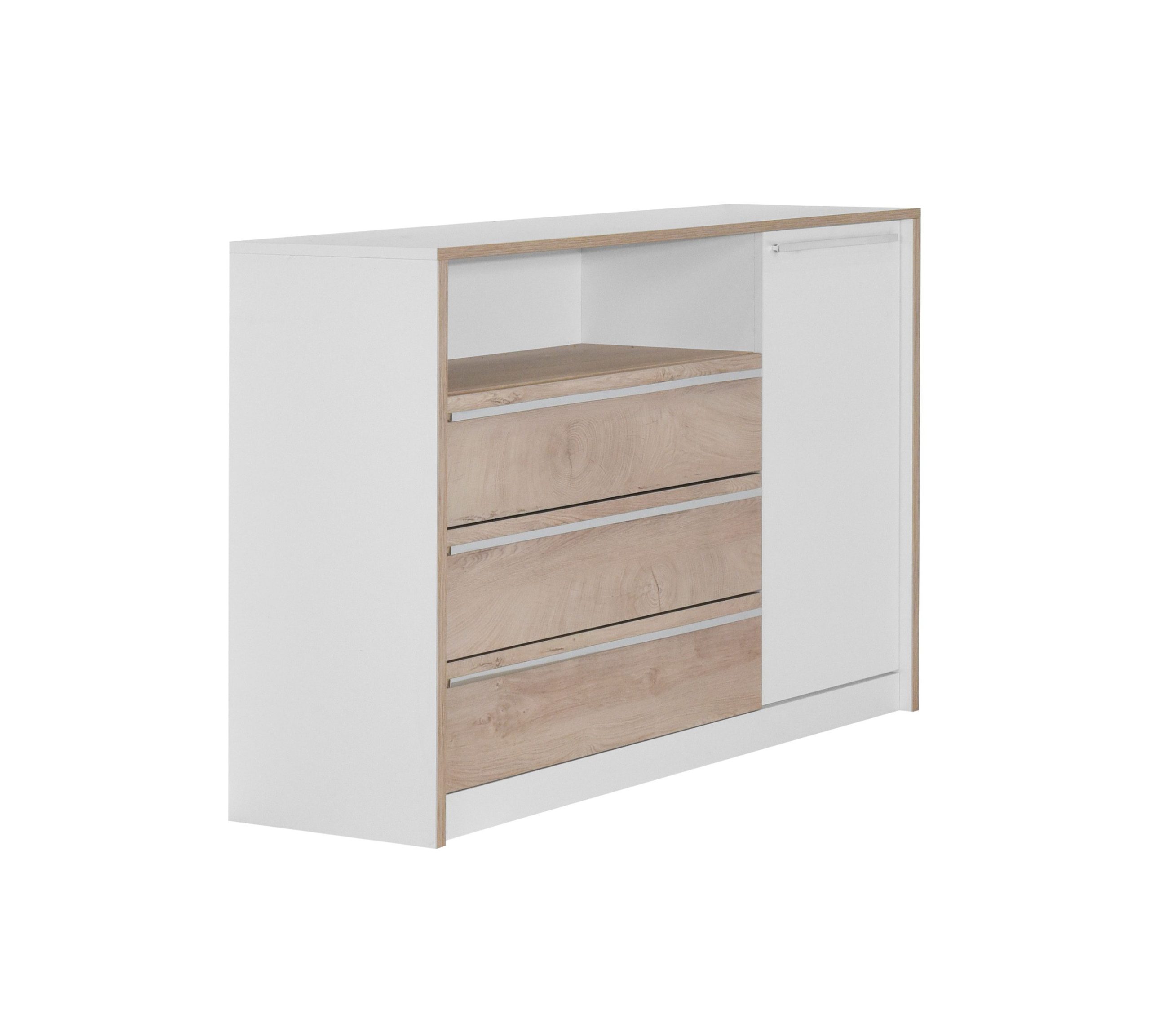 Комода Калиопа 1В3Ф – стилска и практична со три фиоки и една врата. Совршена за уреден дом, достапна во два модерни декора.