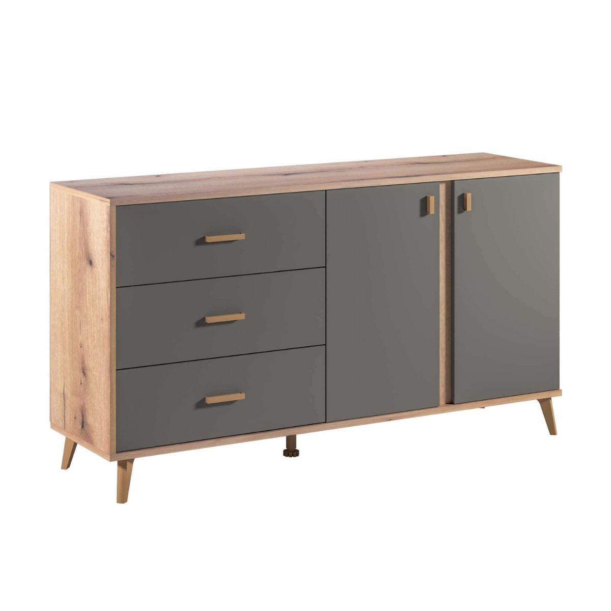 Изработена од квалитетна иверка со дебелина од 16 мм и заштитна ABS кант трака, оваа комода е достапна во две модерни и природни комбинации на бои: