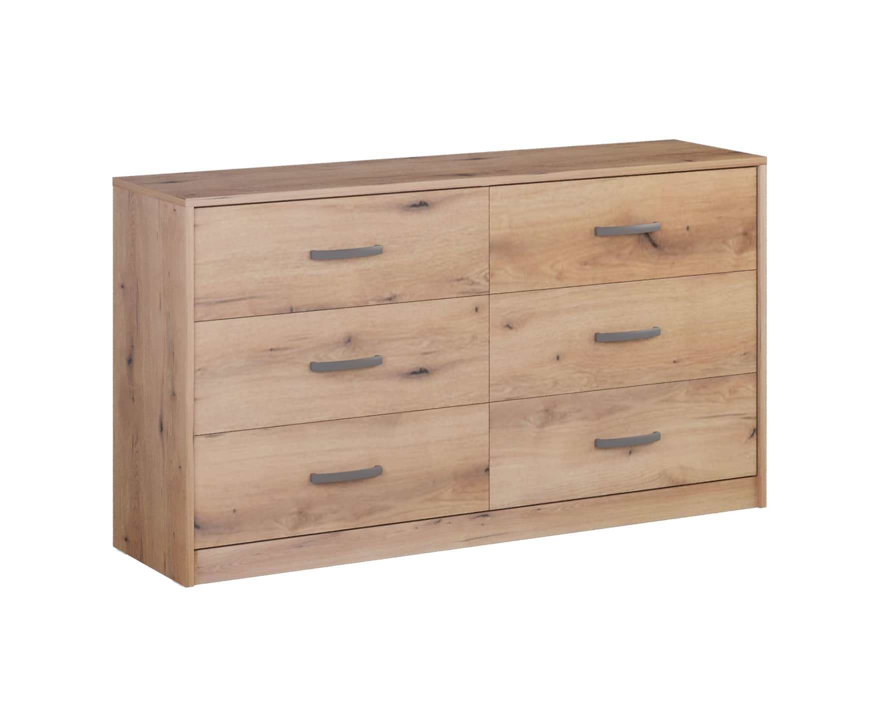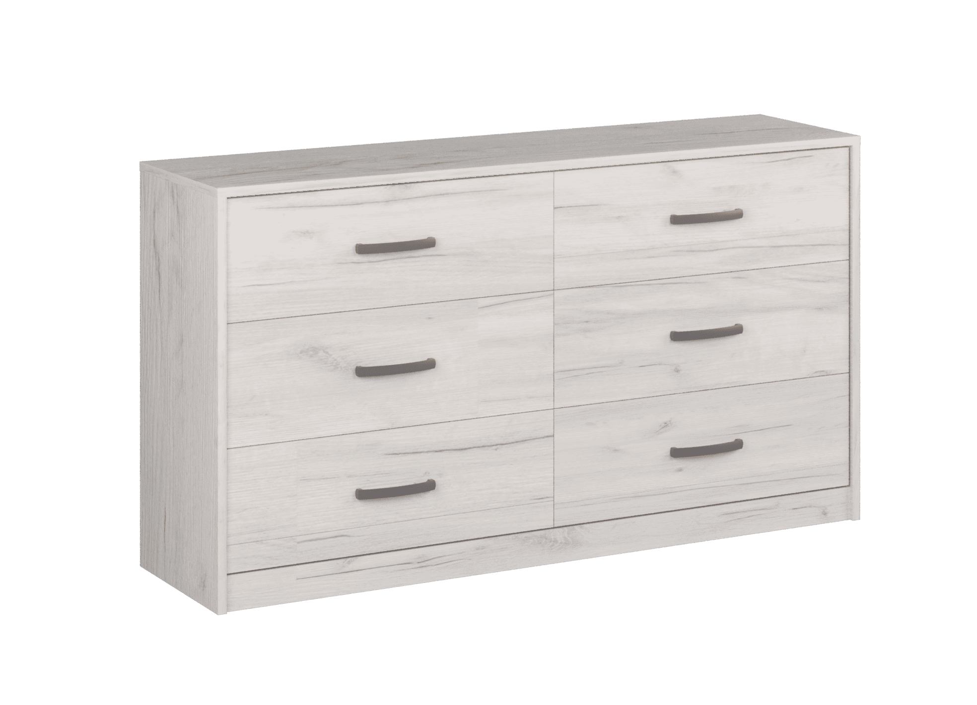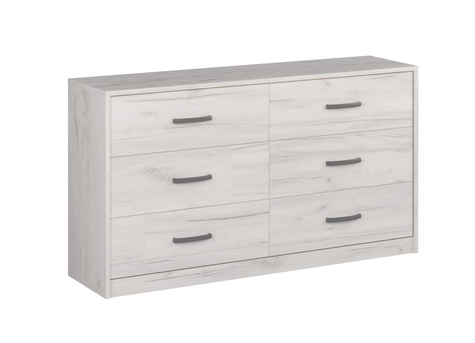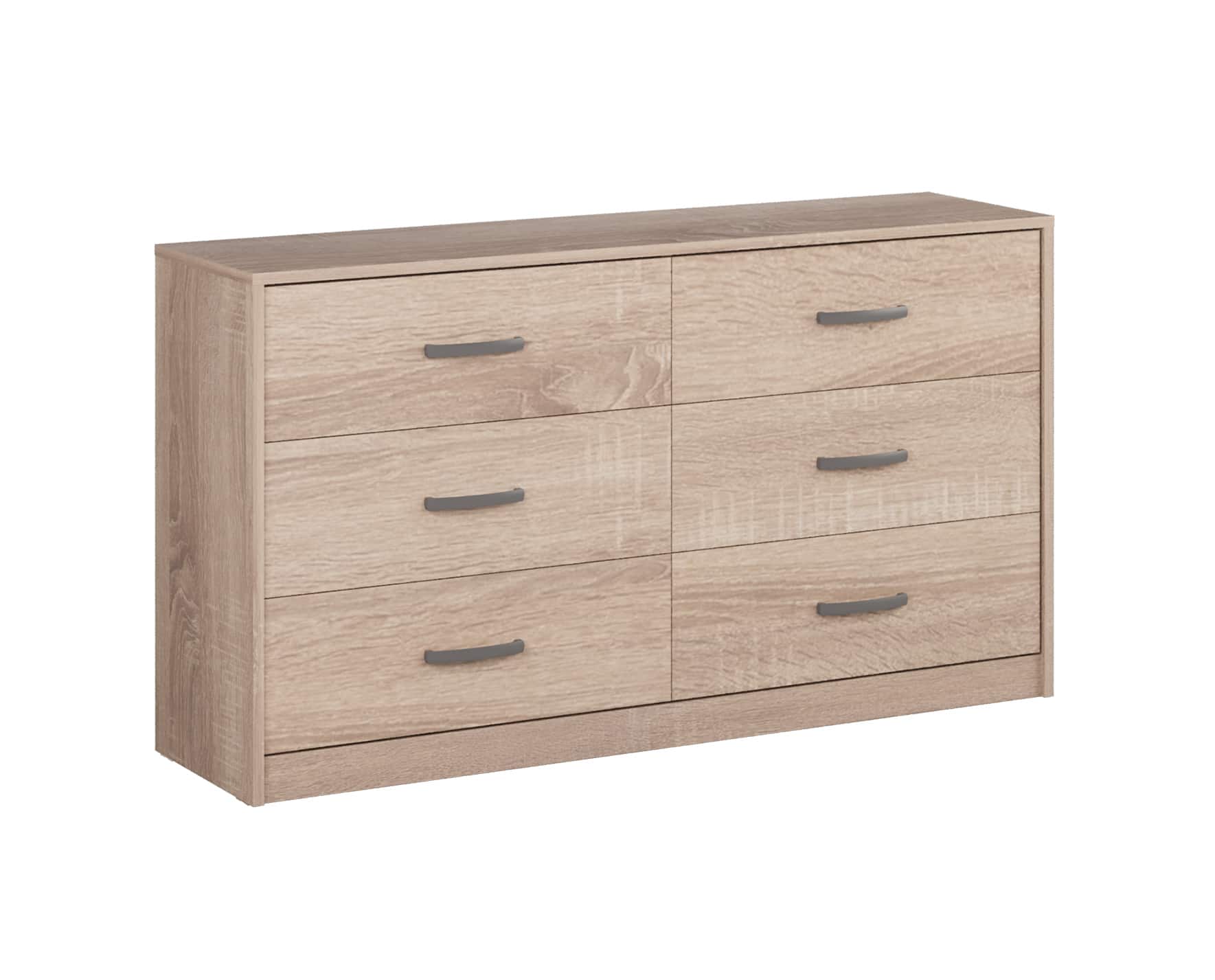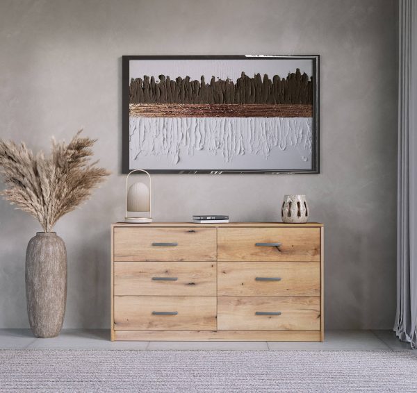 Комода Рома 6 е стилски и елегантен елемент кој веднаш ја освежува просторијата и донесува организираност со минималистички дизајн. Комода Рома 6 е стилски и елегантен елемент кој ја освежува просторијата, достапен во три природни декори: артисан храст, снежен храст и храст.