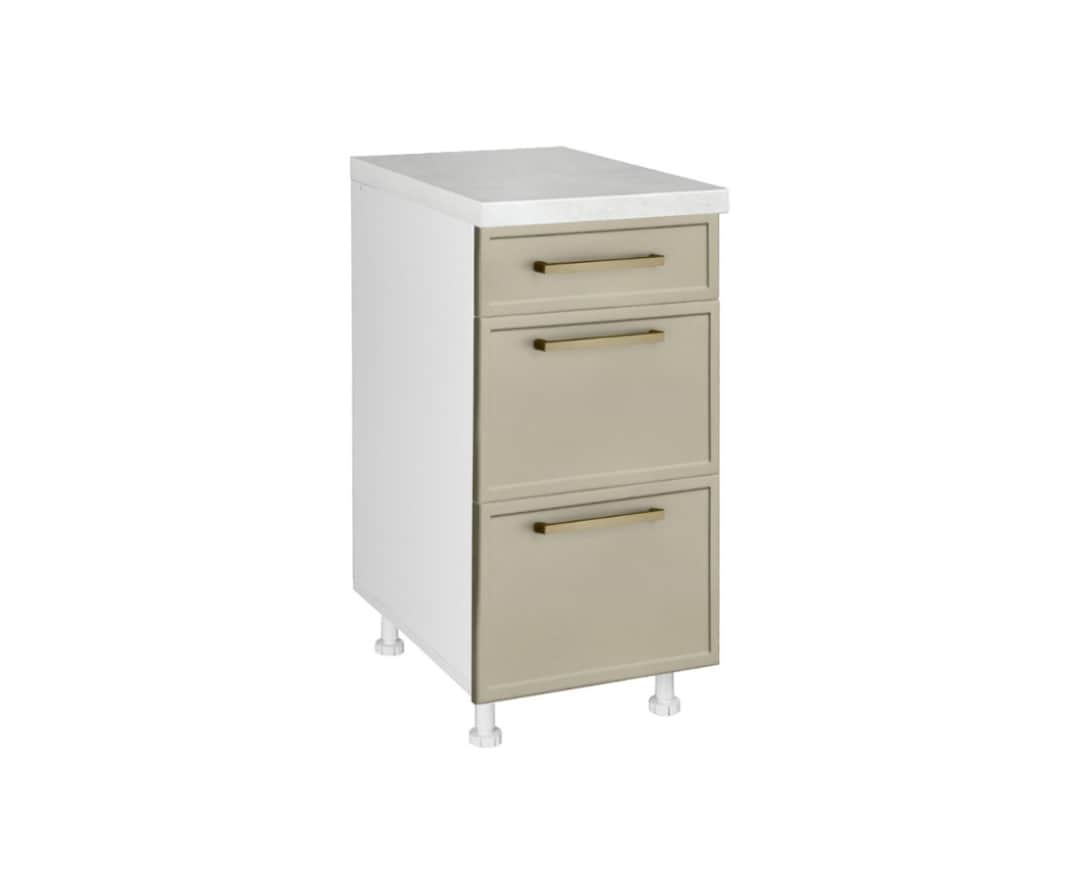 Алба Д40 3Ф Б е компактен долен елемент со три фиоки, идеален за организирање прибор, мали додатоци и кујнски алатки. Неговата ширина од 40 см го прави погоден и за помали кујни.