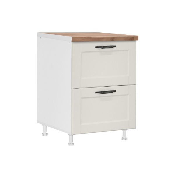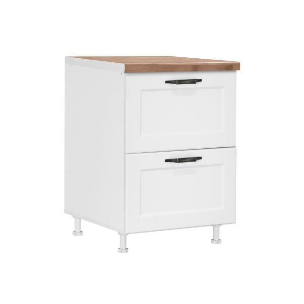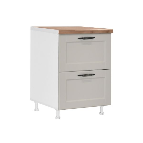 Фронтот е изработен од 19 мм МДФ (медијапан), кој обезбедува цврстина, рамна површина и модерен визуелен изглед, додека корпусот е направен од 18 мм иверица за стабилност и долготрајност. Металните рачки додаваат модерен и практичен завршеток, овозможувајќи удобно секојдневно користење. Модулот има 2 фиоки со пл-бокс систем, кој овозможува организирано складирање и лесен пристап до садовите и кујнските додатоци.