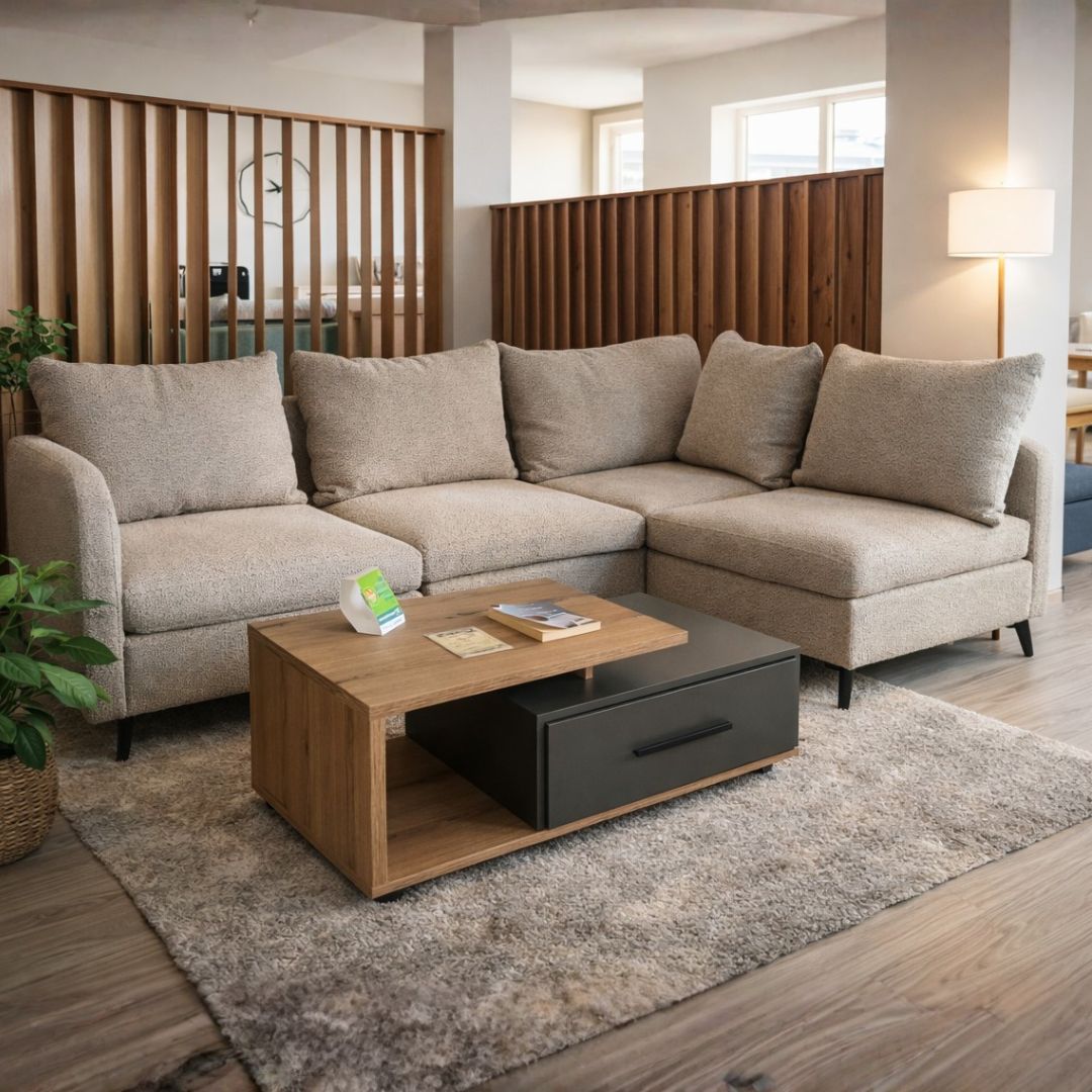 Модуларна гарнитура Комо ТКД – експонат, нуди интелигентно решение за уредување на дневната соба. Благодарение на нејзината модуларна структура, можете слободно да ги комбинирате и распоредувате елементите според вашите желби и просторни услови – линеарно, аголно или во U-форма.
