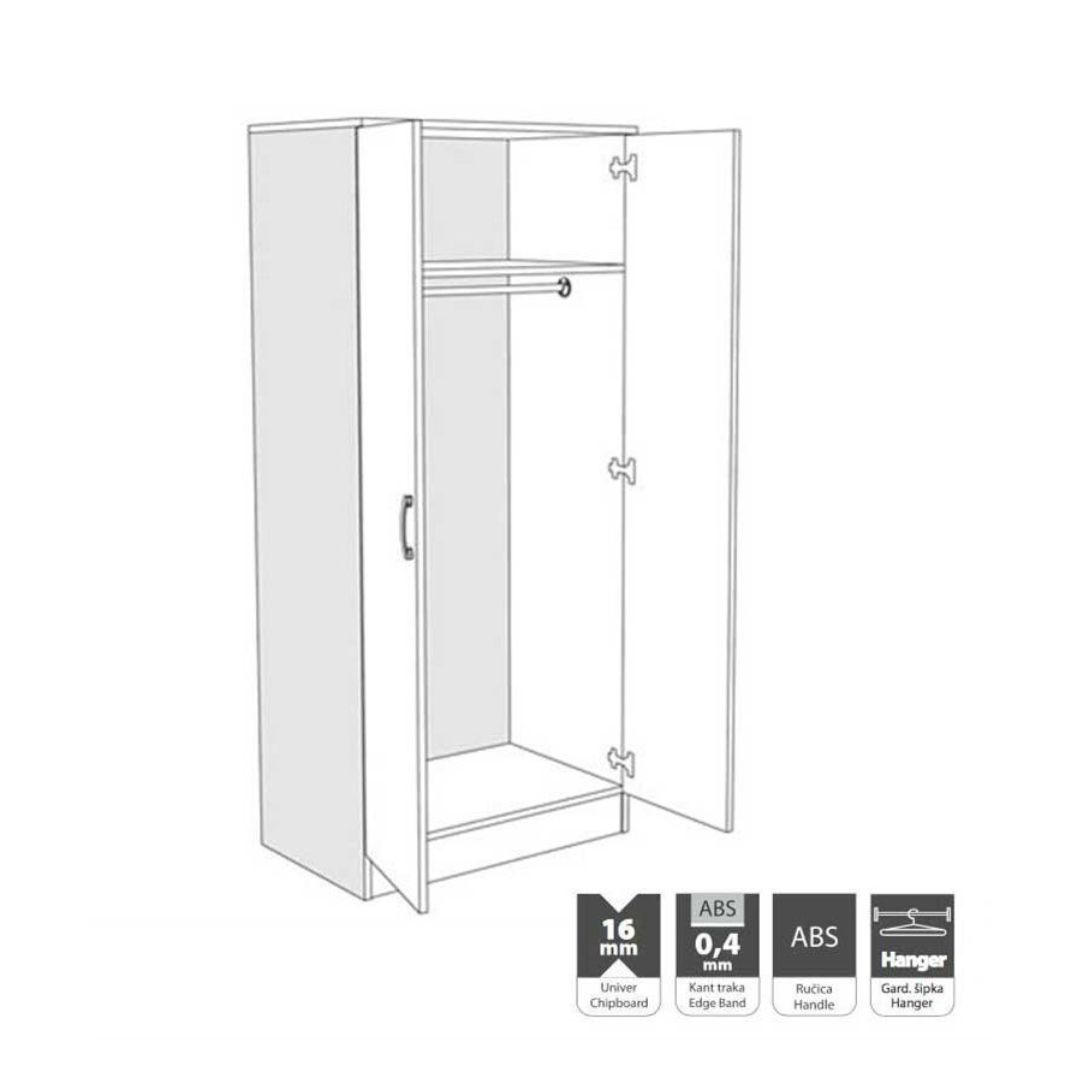 Ормарот Ива 2К е функционален и стилски избор за спална, детска соба или претсобје. Со ширина од 82 см, длабочина 53 см и висина 200 см, нуди оптимален простор за складирање без да зазема премногу место.