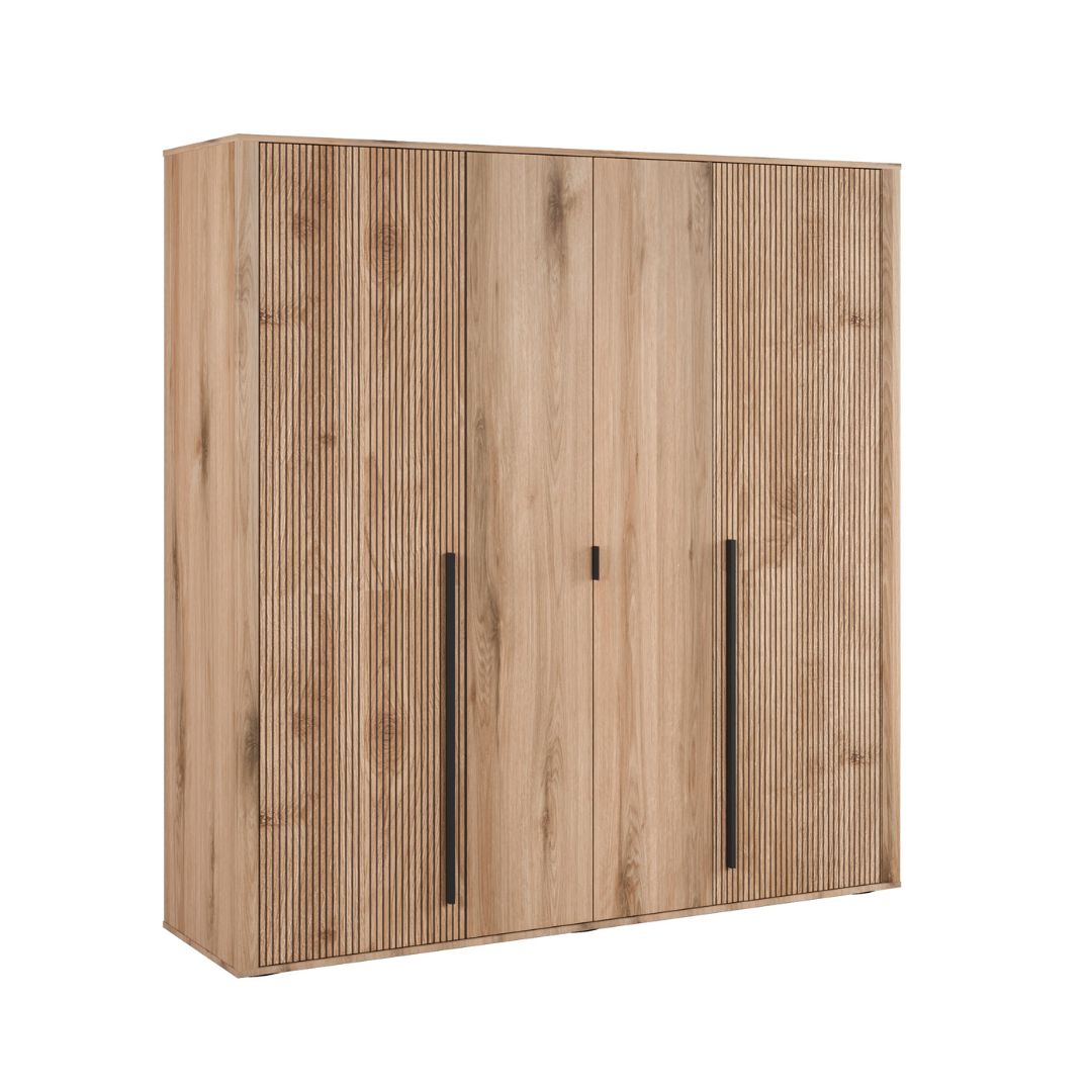 Елегантен и просторно организиран гардеробер од колекцијата Малага, совршен за модерни спални соби. Ормар 4В е дизајниран без огледало, нудејќи чиста естетика, функционалност и практична цена. Изработен е од квалитетена оплеменета иверка (универ 18 mm) во топол дрвен декор канела, со алуминиумски рачки што додаваат модерен изглед.