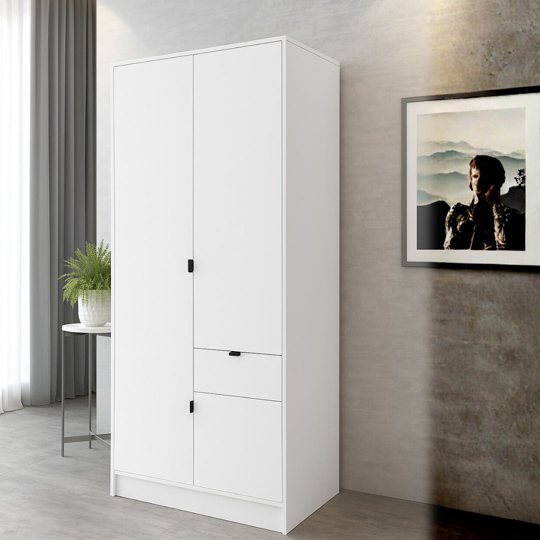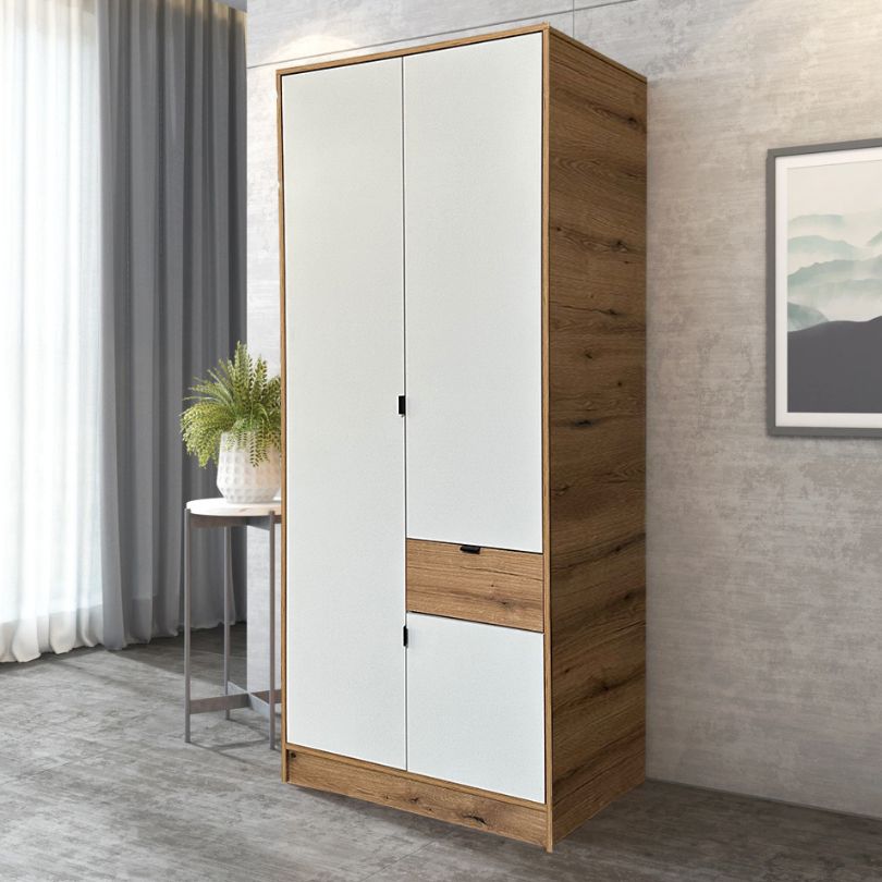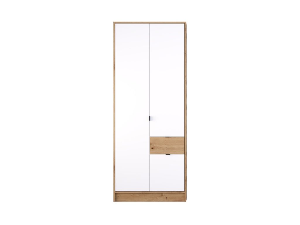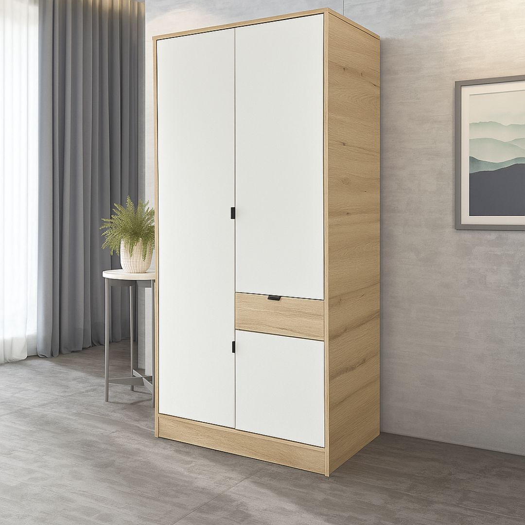 Плакар БОН 2К со 2 врати и фиока претставува совршен баланс на стил, практичност и современ дизајн—карактеристики што треба да ги поседува секој современ плакар во домот. Со својата функционална форма и чисти линии, овој модел нуди извонредна организација и идеално се вклопува во модерни, класични или минималистички ентериери. Комбинацијата на светли бели врати и топол дрвен декор (Сонома или друг избор) создава визуелно пријатен контраст и носи свежина во просторот. Рачките и рамките се дискретни, во црна нијанса, што му дава елегантен и модерен допир.