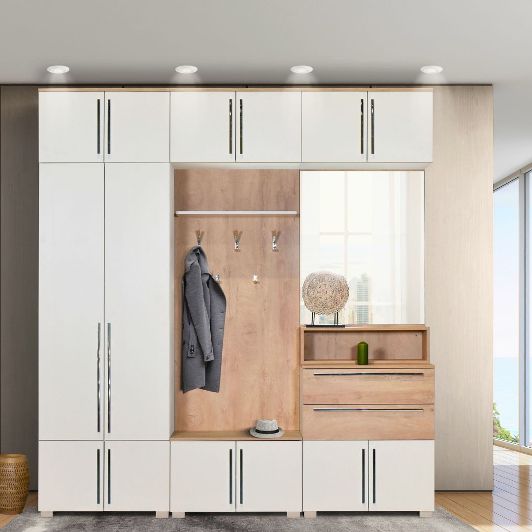 Претсобје Леонидас сет 4 – модерен сет во бело/премиум храст со ормар, комоди, закачалкa и огледало за стилски и организиран влезен простор.