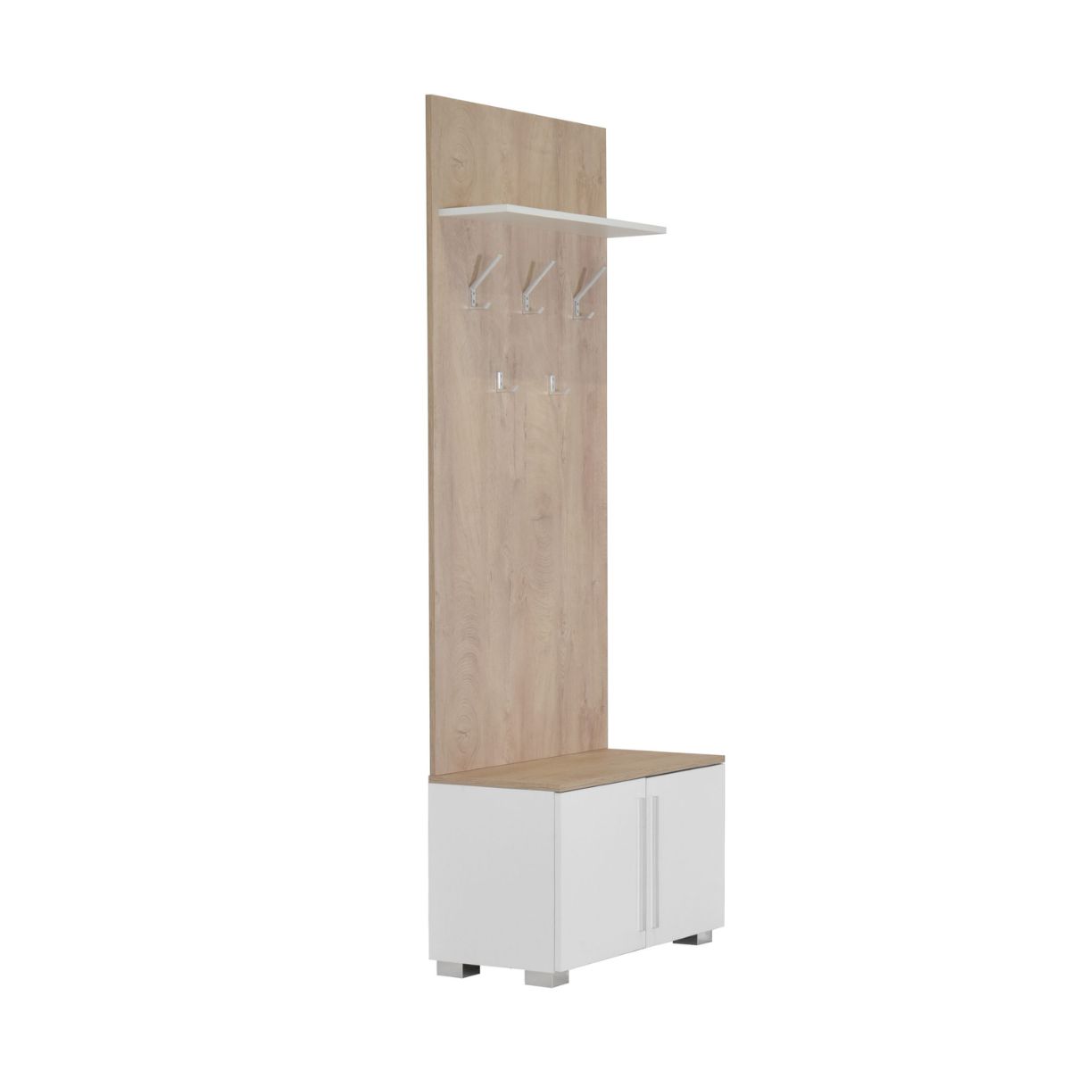 Закачалката со комода Леонидас 80 е идеално решение за организирање на вашиот влезен простор со стил и практичност. Со пространи димензии од 80 x 38 x 215 см, нуди доволно место за складирање палта, чанти и обувки, сè на едно место.