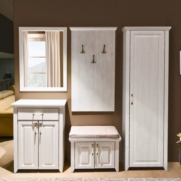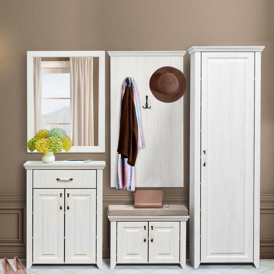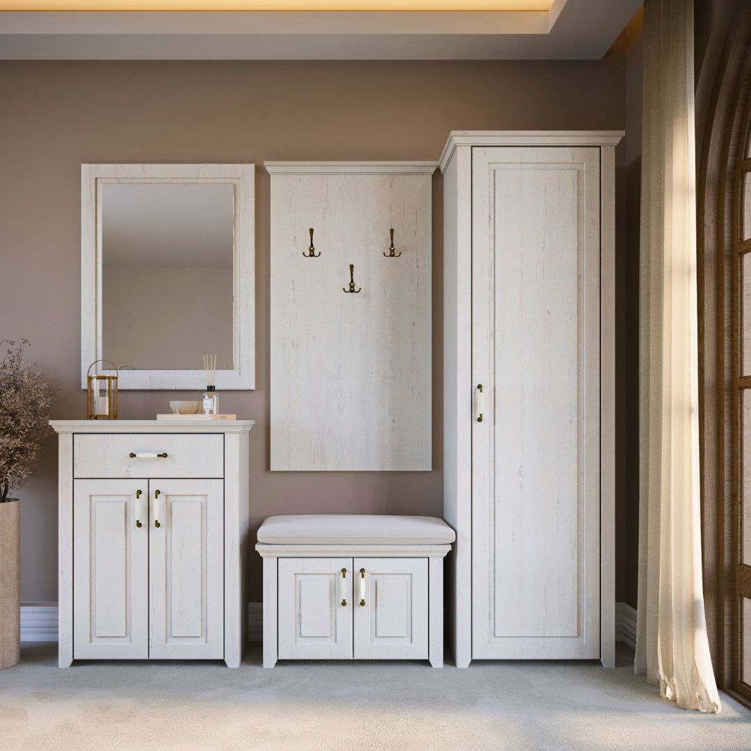 Претсобје Рустик – комплетно решение со ормар, огледало, закачалка, чевларник и комода со перница – стил, ред и природна топлина на едно место.