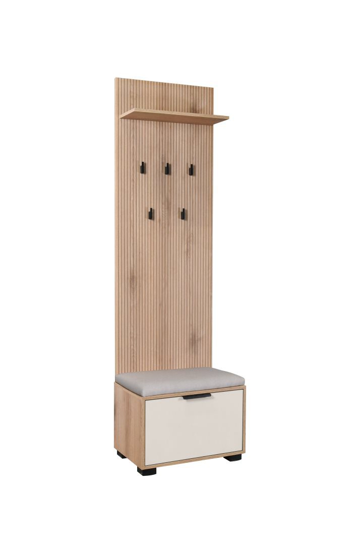 Комодата со закачалка од колекцијата Смарт е практично решение за вашиот влезен простор. Со димензии 60 x 38 x 205 cm, ова парче мебел нуди доволно простор за организирање на облека, додатоци и чевли, додека закачалката овозможува лесен пристап до јакни и палта.