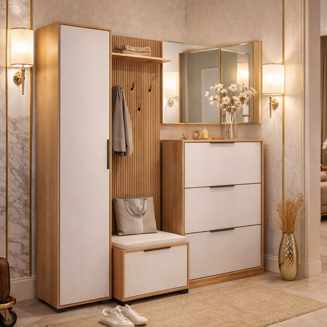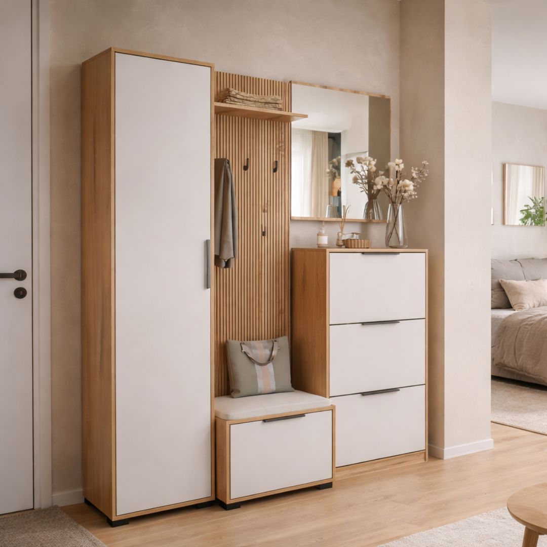 Внесете ред, функционалност и модерен изглед во вашиот влезен простор со модуларното претсобје „Смарт“. Овој систем нуди флексибилност и можност за персонализирање според вашите потреби и простор.