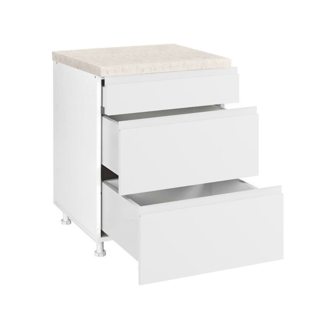 - Висината на пултот изнесува 820 мм, додека ширината на работната плоча се прилагодува според избраните елементи и секогаш е поширока за дополнителни 8 см. Работната плоча е со дебелина од 38 мм и е достапна во декорите F206 Црн мермер и K704 Перлино.