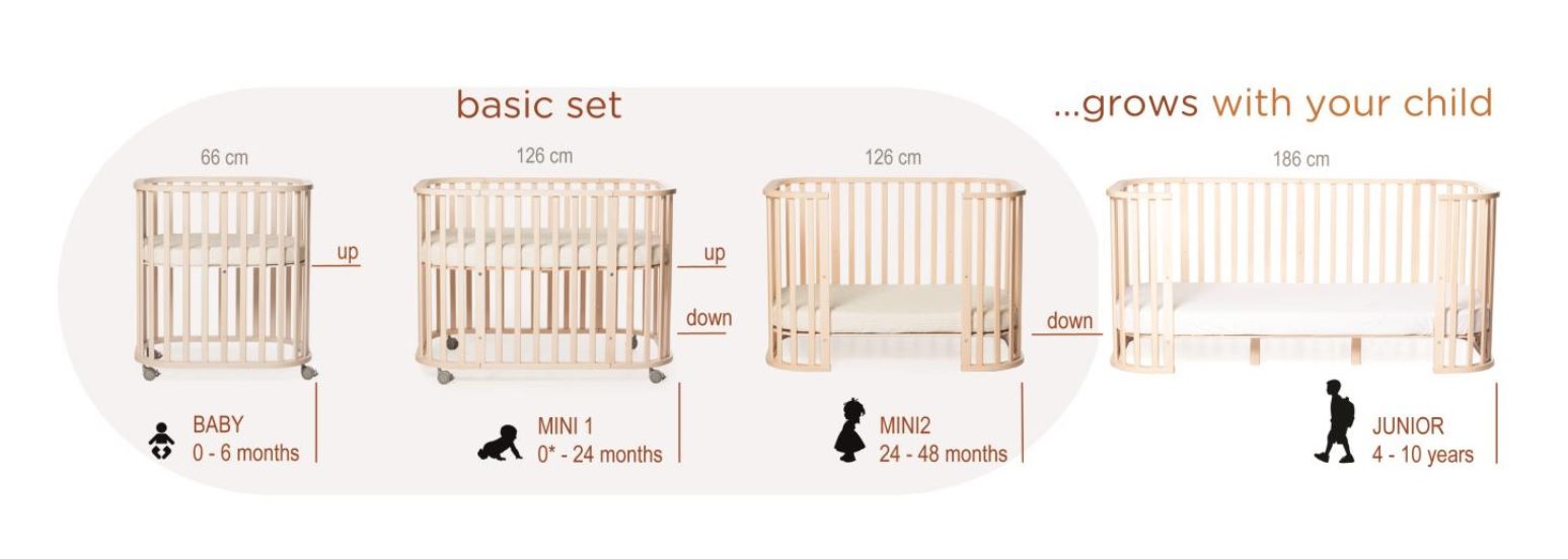 MINI е креветче кое може да се користи за дете од самото раѓање (со положбата на душекот поставен горе), но најдобро е да се користи од 6 месечна возраст или од моментот кога детето ќе може самостојно да седи (со положбата на душекот надолу. ). Ширината на Mini креветчето е 83cm, должина 126cm и висина 81cm/90cm со поставени тркалца. MINI има висина на душек поставена на 65 cm, мерена од горниот раб на креветчето. MINI се добива со едноставно надградба на BABY со екстензии вклучени во секој сет. Со поврзување на додатоците и спуштање на положбата на душекот добиваме прекрасно креветче во кое вашето бебе ќе ги помине следните 3 години.Креветчето е многу прозрачно и ви овозможува секогаш да го гледате вашето дете низ оградата, а ниската положба на душекот го штити вашето дете да биде безбедно дури и кога ќе почне да оди.