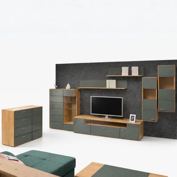 Сетот е комплетно функционално решение и вклучува витрински елементи (висечка, висока и ниска стаклена витрина), ТВ комода, клуб маса и ѕидни полици – сè што е потребно за уреден и стилски дневен простор.