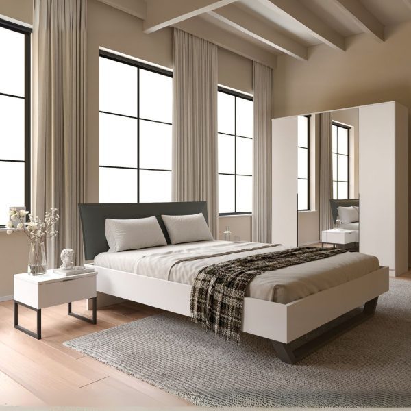 Просторен и стабилен кревет за душеци 160×200 см, изработен од квалитетена иверка, со елегантен наслон и метални ногарки кои додаваат модерен изглед и стабилност.