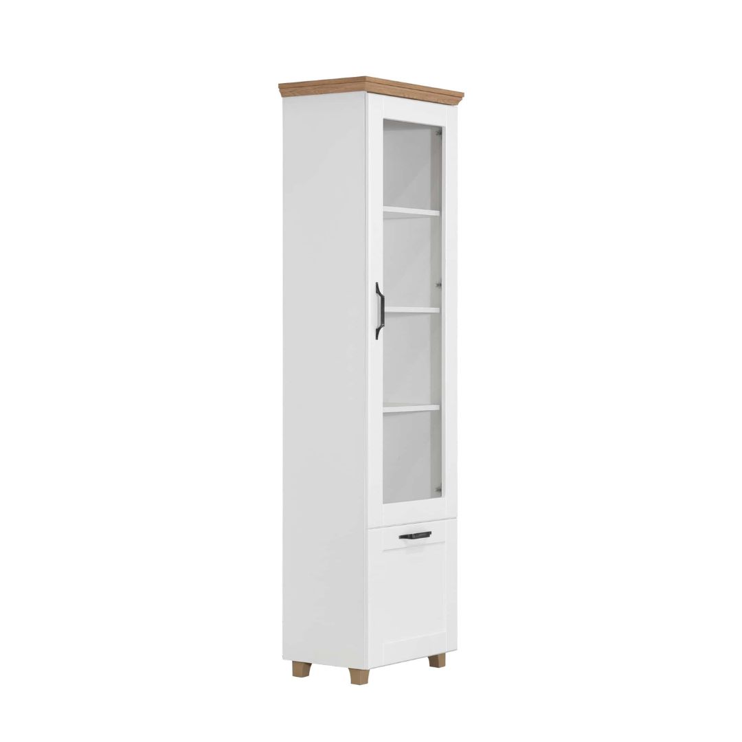 Елегантна и практична стаклена витрина „Контемпо“ во современи дезени артисан бело и сиво. Совршена за изложување на вашите омилени предмети, книги или сувенири, со цврста конструкција и стилски метални рачки. Нејзиниот модерен дизајн со чисти линии и стаклени елементи додава чувство на просторност и светлина во просторијата. Внатрешните полици овозможуваат функционална организација, а стаклото на вратата овозможува прегледност на декорациите. Благодарение на висококвалитетните материјали, витрината обезбедува долготрајна стабилност и лесно одржување. Комбинацијата на дрвен декор и стакло внесува софистициран баланс помеѓу топлина и елеганција. Контемпо витрината е совршен избор за сите кои сакаат модерен, уреден и инспиративен дом.