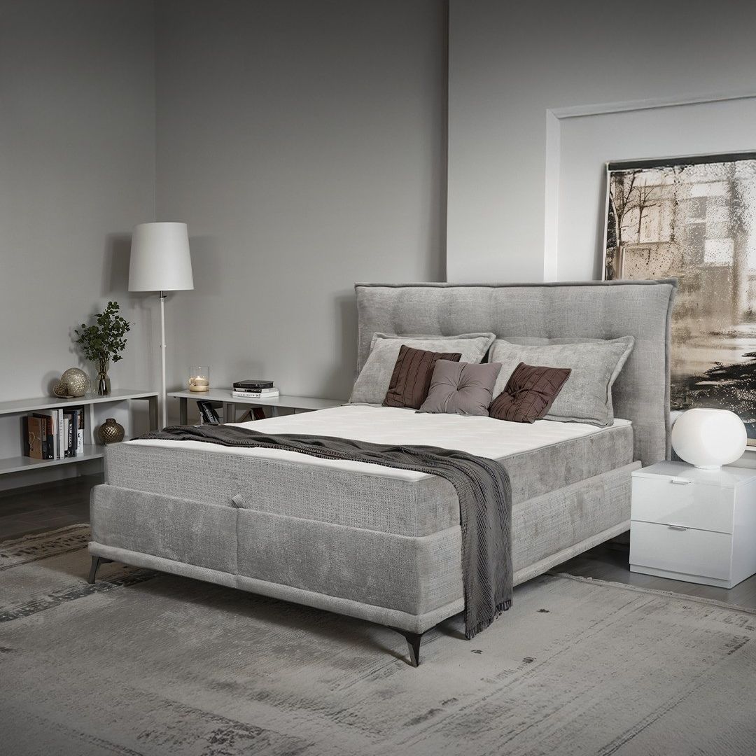 Производ со современ дизајн кој ни овозможува да се креира амбиент во согласност со намената на просторот, посакуваниот израз и современите трендови. Узглавјето на креветот е дизајнирано за да комбинира естетика и функционалност. Подлогата на креветот е опремена со латофлекс летвички и челична рамка, обезбедувајќи долготрајна издржливост и стабилност. Лежај Бали има голема кутија за постелнина која овозможува практично складирање. - Душек Бали – 200×160, сива