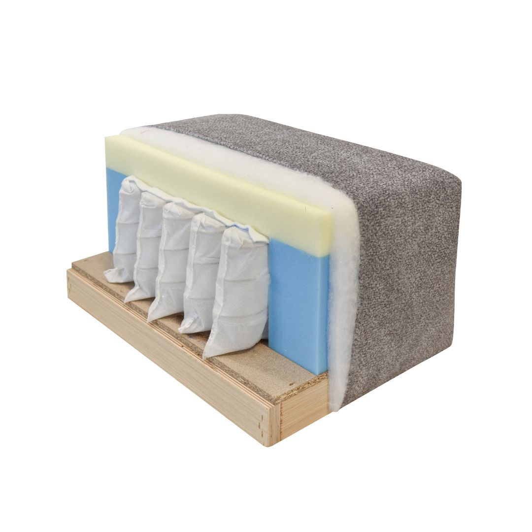 Цврсто буково и чамово дрво, иверица, лесонит, лепак, спојници, неткаен текстил, ПУ(полиуретанска)пена, џебно жичано јадро, ткаенина за мебел, ногарки