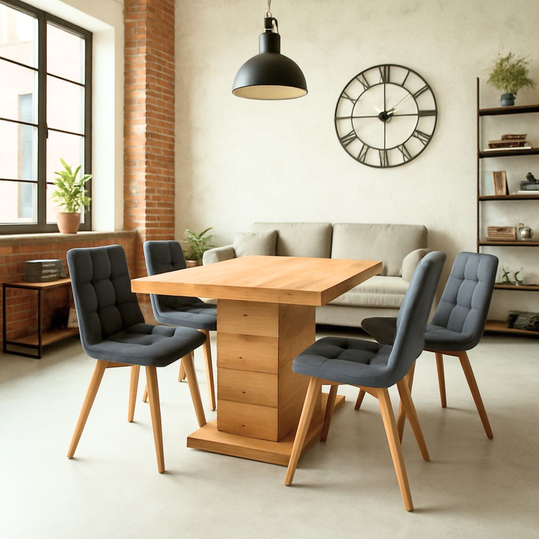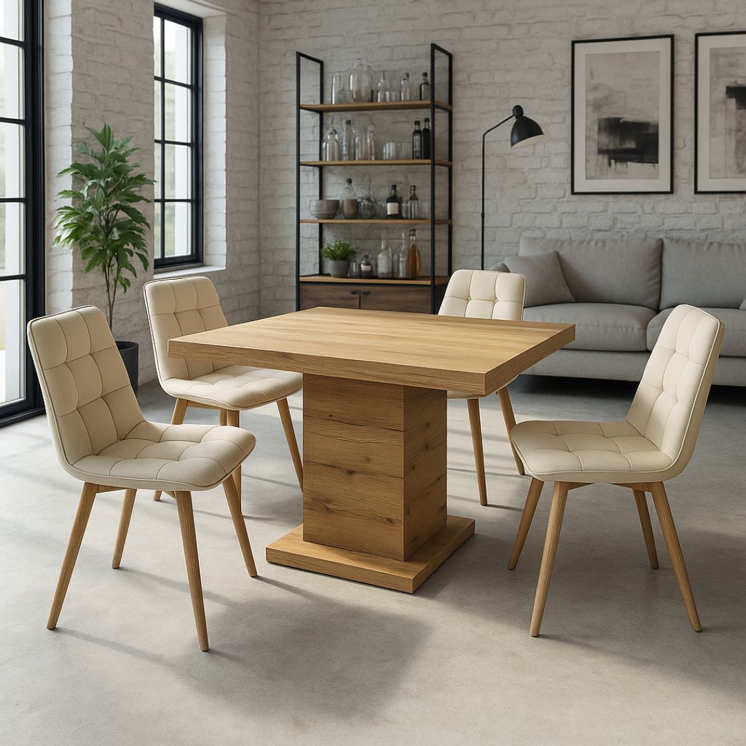 Изработена е од висококвалитетна иверка, обложена со артисан храст фурнир кој и дава природен изглед и додава топлина и автентичност на ентериерот. Комбинацијата со централна масивна ногарка обезбедува стабилност, но и слобода за поставување столици без ограничување – што ја прави идеална за секој агол на трпезаријата.